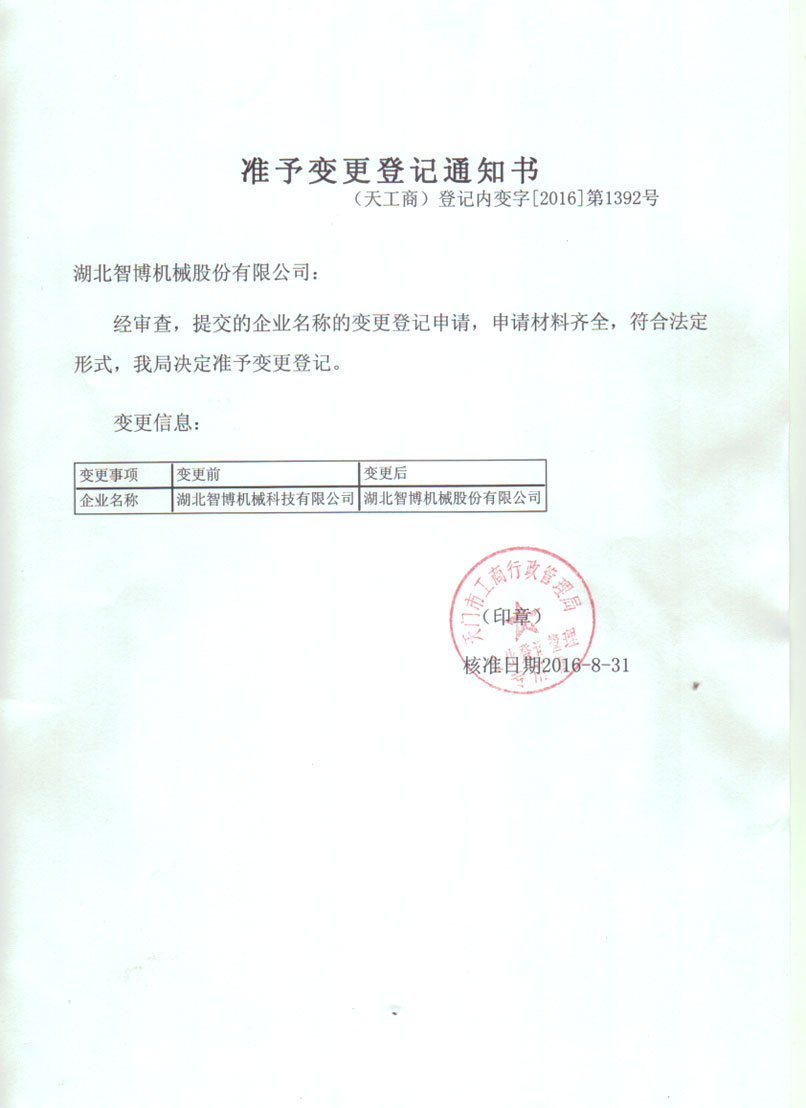 準(zhǔn)予變更登記通知書